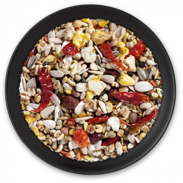 Girasol raiado, Girassol branco, Cártamo, Trigo-sarraceno, Cânhamo, Aveia descascada, Arroz paddy, Sorgo branco, Sorgo vermelho, Alpista, Milho alvo branco, Milho alvo vermelho, Pevides, Semente de pepino, Trigo tufado, Milho tufado, Nozes de cedro, Passas, Rosa mosqueta, Malaguetas, Pedaços de cenoura e Bagas de sorveira. | Várias cores e tamanhos | |